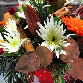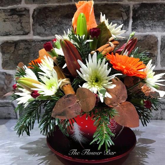 Featuring a Red Lily, Cream Chrysanthemums ,Orange Germini and Red Spray Carnations with Cinnamon Sticks and Copper Eucalyptus and Festive foliage