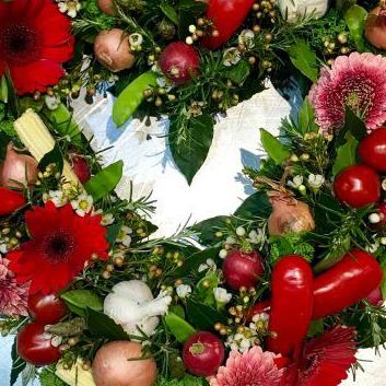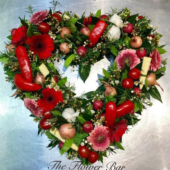 This heart frame is full of different vegetables. From baby corn to curly kale, fresh chillies, radishes, shallots, mange tout and not forgetting the ripe vine tomatoes. We used rosemary and the curly kale as foliage and added in some bright red and pink mini gerbera.