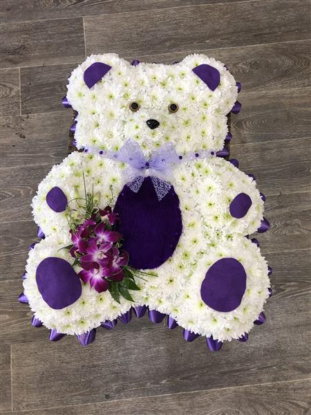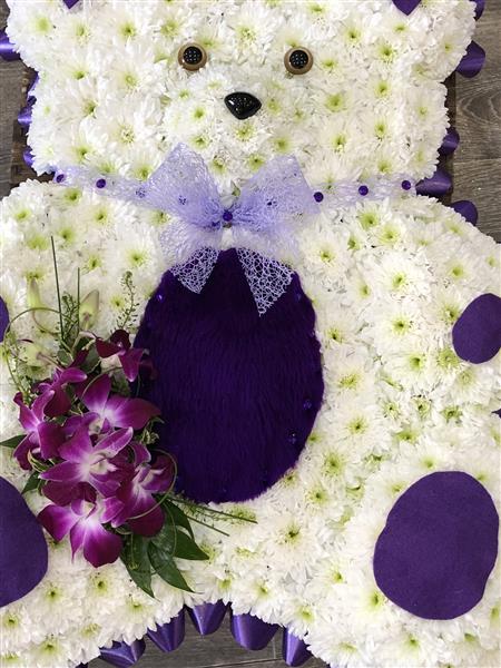 Double spray chrysanthemums are used to create this design shaped like a Teddy Bear with flower sprays to compliment.
